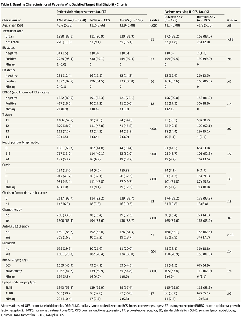 2647/3434名患者满足纳入目标试验队列标准,以评估3个治疗组的疗效差异,以及2年的治疗时间与RFS的相关性。888/2260名起始他莫昔芬单药治疗的患者、144/232名起始使用他莫昔芬联合OFS的患者、108/155名起始芳香化酶抑制剂联合OFS的患者遵守方案。此外,192名患者使用内分泌(他莫昔芬或芳香化酶抑制剂)联合OFS治疗2年或更长时间,195名患者则不到2年。在肿瘤分期、阳性淋巴结数量、肿瘤分级、乳腺手术类型以及接受化疗和放疗方面,3个治疗组存在显著差异;内分泌联合OFS的持续时间为2年或更长亚组与少于2年亚组之间无显著差异。