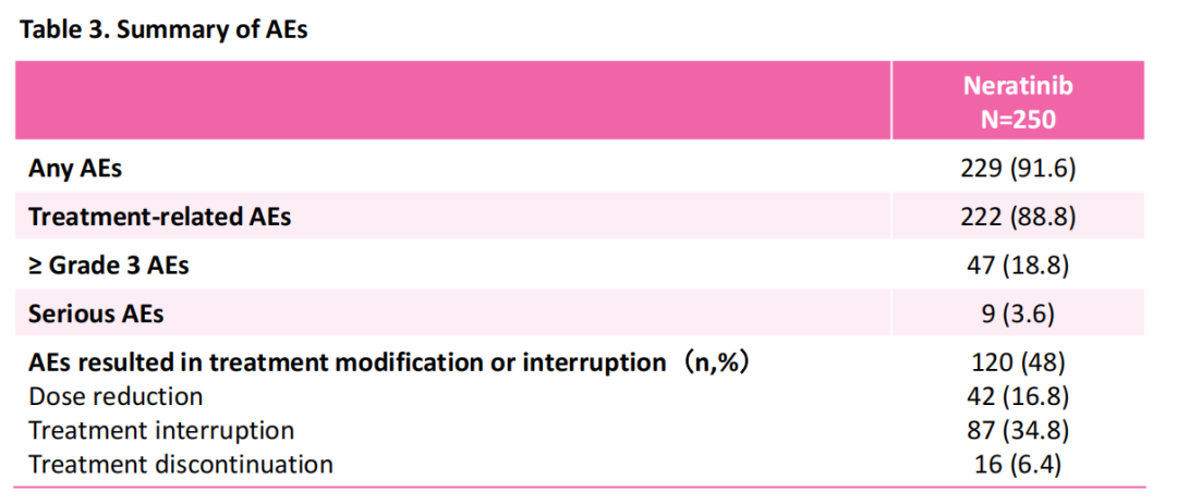 3.6%的患者报告了严重不良事件(SAE),18.8%的患者报告了≥3级不良事件(AE)。任何级别的最常见AE为腹泻(80.4%)、恶心(20.4%)、疲劳(14.4%)和食欲下降(14.4%)。腹泻主要为1级或2级(65.6%),而≥3级腹泻在14.8%的患者中被报告。从开始奈拉替尼治疗至发生腹泻的中位时间为3.0天(IQR:2~5)。