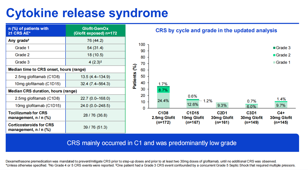 Glofit-GemOx方案的安全性概况与其组成药物的已知风险相一致,且与前期的中期分析结果呈现一致性,呈现出高度的稳定性和可靠性。尽管Glofit-GemOx组的3-4级、5级(主要与COVID-19相关)及严重的不良事件(AE)发生率上高于R-GemOx(分别为:69.4%vs 36.4%、8.3%vs 4.5%、54.4%vs 17.0%),但经暴露校正后,两组的AE发生率相似。即便在新冠疫情流行的背景下,严重不良事件的发生率仍然处于可控范围内。在接受格菲妥单抗治疗时,细胞因子释放综合征(CRS)一直是临床医生重点关注的AE。然而,Glofit-GemOx联合方案中CRS主要发生在第一个周期,且大多为低级别。更令人惊喜的是,Glofit-GemOx的CRS发生率相较于单独使用格菲妥单抗(NP30179研究)时有所降低2,分别为:1级31.4%vs 48%,2级10.5%vs12%,3级2.3%vs 3%,显示出Glofit-GemOx联合方案为治疗安全增添了新的保障。此外,仅有2.3%的患者报告了与CRS同时发生的与免疫效应细胞相关神经毒性综合征一致的事件。