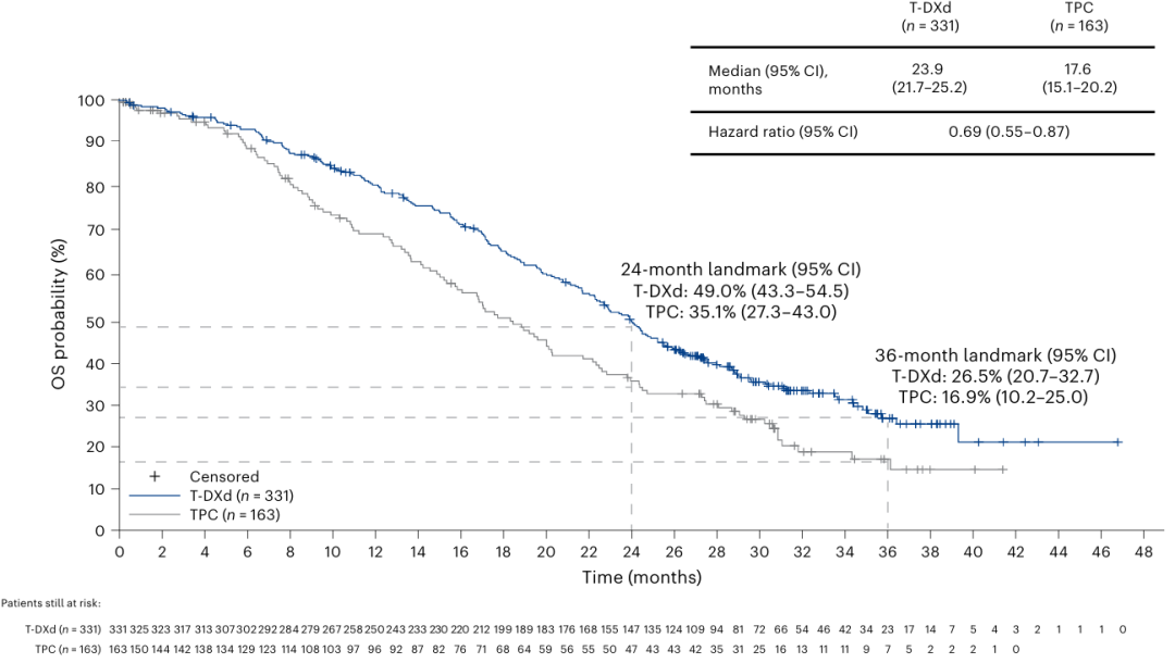 T-DXd的安全性与主要分析结果一致。至更新数据截止日期,T-DXd组的中位治疗持续时间为8.2个月(vs.TPC组为3.5个月)。两组任何级别的治疗期间不良事件(TEAE)发生率相似(T-DXd组为99.5%vs.TPC组为98.3%)。T-DXd组有202例患者(54.4%)发生≥3级TEAE,TPC组为116例患者(67.4%)。T-DXd组和TPC组分别有62例(16.7%)和14例(8.1%)患者因治疗期间出现的不良事件而停止治疗。