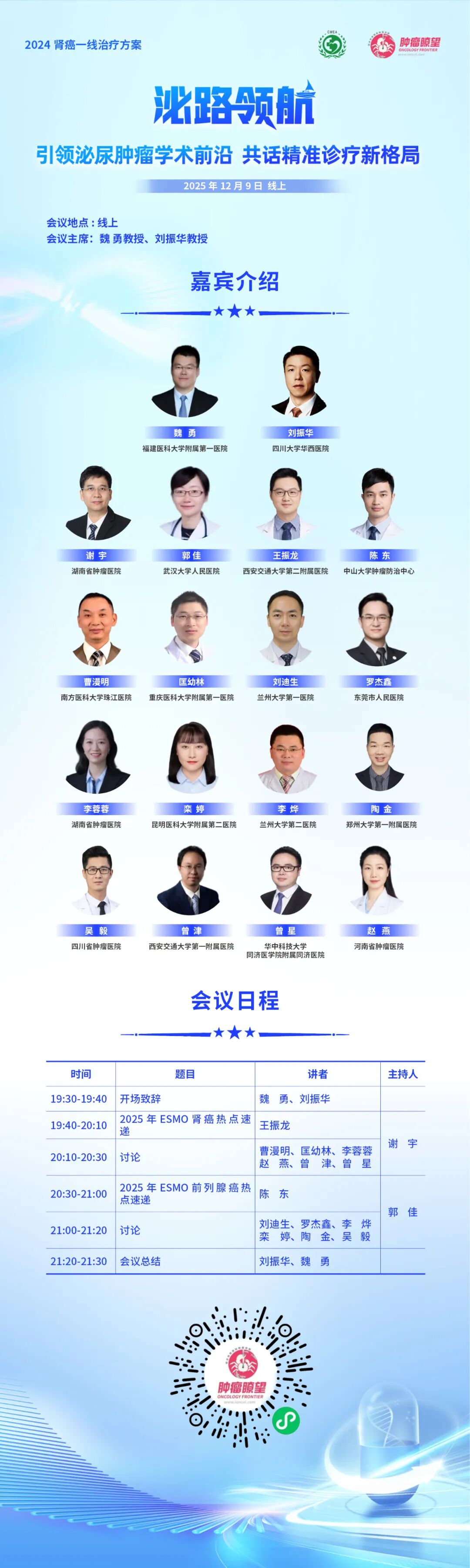 扫描海报下方二维码预约直播!12月9日19:30~21:30和12月10日19:00~21:00,期待与您线上相见,携手“泌路领航”,共同推动我国泌尿肿瘤诊疗事业迈向新台阶!