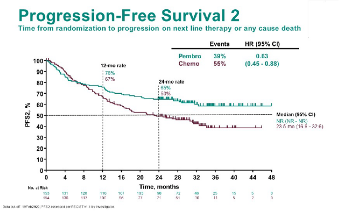 结果:在数据截止时,共有307例患者被随机分组(153例接受帕博利珠单抗治疗,154例接受化疗)。中位(范围)研究随访时间为32.4个月(24.0~48.3)。PFS方面,帕博利珠单抗优于化疗(中位16.5个月 vs. 8.2个月;HR 0.60;95%CI:0.45~0.80;P=0.0002)。帕博利珠单抗组12个月和24个月的PFS率分别为55.3%和48.3%,化疗组为37.3%和18.6%。确认ORR为43.8% vs. 33.1%;帕博利珠单抗组的中位DOR中位(范围)未达到(2.3+至41.4+),化疗组的中位DOR为10.6个月(2.8~37.5+)。与化疗组相比,帕博利珠单抗组的PFS2时间更长(中位PFS2未达到 vs. 23.5个月;HR 0.63;95%CI:0.45~0.88)(见下图)。OS的分析正在进行中。帕博利珠单抗组和化疗组的3级治疗相关不良事件(TRAE)发生率为22% vs. 66%。帕博利珠单抗组无5级TRAEs发生,化疗组1例5级TRAE,为肠穿孔。与化疗相比,帕博利珠单抗组的HRQoL评分有所改善。