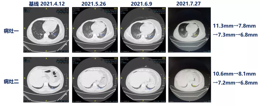 靶病灶:肝脏(MR)9mm+5mm,脑(MR)15.1mm,肺(CT)6.8mm+6.8mm;靶病灶直径总和=42.7mm,达PR。