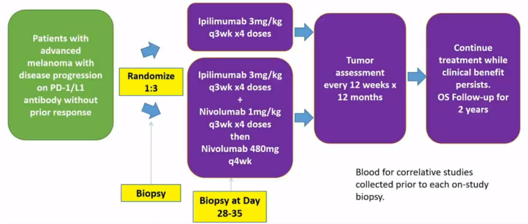 1. CTLA-4 + PD-1仍是PD-1耐药后的重要选择之一,既往报道有效率约为27-30%,支持其开展随机对照研究。本次AACR报道的这两项研究都是针对双免(CTLA-4+PD-1单抗)治疗PD-1单抗耐药的前瞻性对照研究,在PD-1后治疗时代有一定的意义,能部分解决一部分患者的耐药问题。