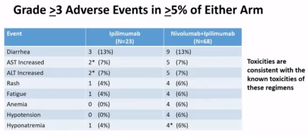 两组的不良事件发生率相似,两组最常见的≥3级AE均为腹泻(13%)、AST升高(7%)和ALT升高(7%)。在Ipi/Nivo组中,报告了一例因弥漫性血管内凝血导致的治疗相关死亡,在Ipi组中,报告了一例因结肠穿孔导致的治疗相关死亡。