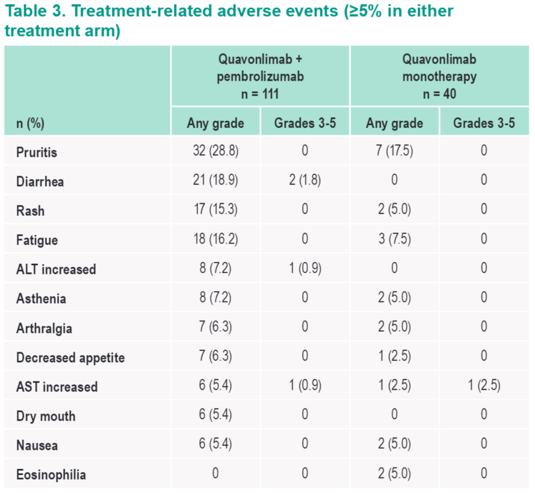 最终共入组151例患者(n=111,Qmab+Pembro组;n=40,Qmab组,对照组满40例后停止入组);从第一次给药到数据库截止的中位时间为7.7个月。入组患者中33%携带BRAF突变,50%存在LDH升高。Qmab+Pembro组和Qmab组分别有87例(78%)和24例(60%)患者出现治疗相关不良事件(TRAE);分别有16例(14%)和3例(8%)患者出现3/4级TRAEs。最常见的TRAEs是瘙痒(26%)、疲劳(14%)、腹泻(14%)和皮疹(13%)。两组均未发生治疗相关死亡;5%的患者因TRAEs而停药。