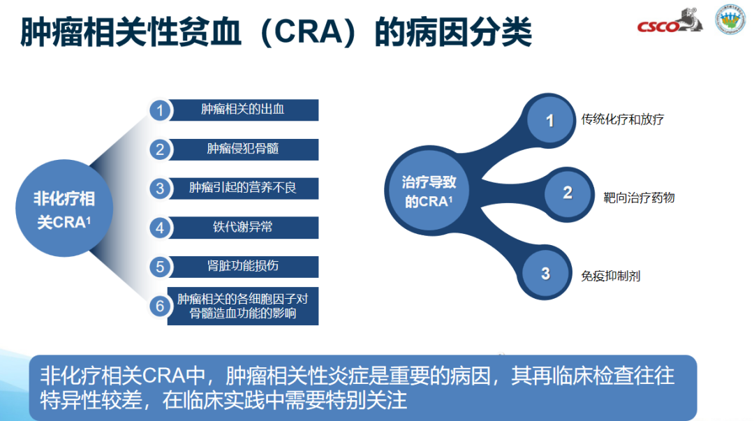 若初步判定贫血为CRA但并非化疗相关,则应考虑肿瘤本身所导致的出血、骨髓侵犯、营养不良或铁代谢异常等原因。若判定CRA为化疗相关,则应进行血液学评估,包括贫血严重程度、伴随症状及合并症,从而决定是否需要输血和接受其他相关治疗。