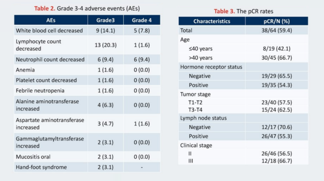 除了“去蒽环”以外,采用其他毒性更小的蒽环类剂型也是临床常用的替代策略。本次ESMO大会上,中山大学孙逸仙纪念医院刘强教授团队报道了一项单臂2期研究[2],使用乙二醇化脂质体阿霉素(PLD)+环磷酰胺(C)+曲帕双靶作为新辅助治疗,可获得59.4%(38/64)的pCR率,4个周期后的ORR高达68.8%;常见的3/4级AE是血细胞计数减少(21.9%)、淋巴细胞计数减少(21.9%)、中性粒细胞计数减少(18.8%),仅有6例患者发生无症状LVEF降低10%,但所有患者的LVEF均在55%以上。