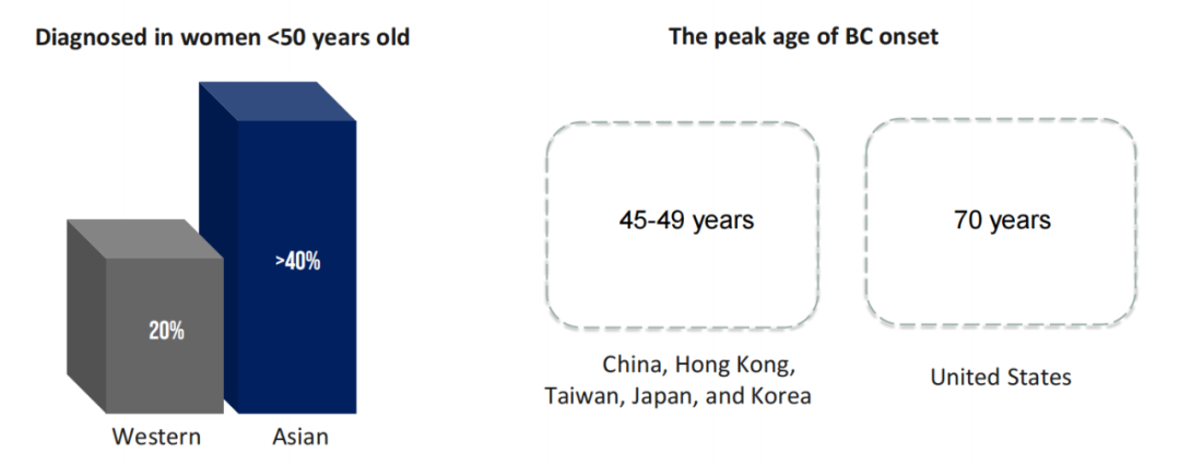 与此同时,亚洲乳腺癌患者的发病年龄与西方国家相比也较早。相关数据显示,西方国家约20%的乳腺癌患者诊断年龄<50岁,而亚洲国家诊断年龄<50岁的乳腺癌患者超过40%。东亚地区(中国,中国香港、中国台湾、日本和韩国)的乳腺癌发病峰值在45~49岁,美国乳腺癌发病峰值约为70岁。