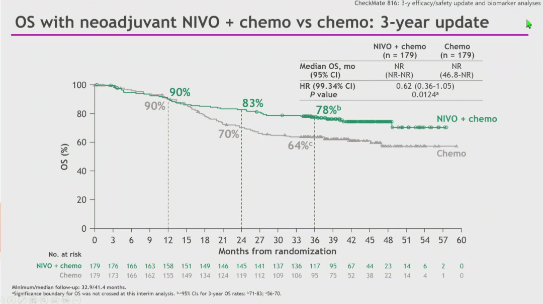 纳武利尤单抗联合铂类双药化疗作为可切除(肿瘤≥4cm或淋巴结阳性)NSCLC的新辅助治疗方案目前已在多个国家获得批准。CheckMate 816研究的无事件生存期(EFS)和病理学完全缓解(pCR)的主要分析结果发表后,该方案在很多地区已成为标准治疗。2023 ELCC发布了CheckMate 816的3年数据更新,结果清楚地表明,新辅助纳武利尤单抗联合化疗对可切除NSCLC患者持续带来EFS获益。从结果中可以看到,在新辅助免疫治疗和手术后疾病进展风险降低约40%的情况下,风险比(HR)依旧和既往数据相似。2023 ELCC还更新了总生存期数据,加强了新辅助纳武利尤单抗联合化疗方案的价值,尽管该联合方案的数据尚不够成熟,无法达到统计学显著性。此时,CheckMate 816发布的复发模式分析数据也让我们能更好地了解两组患者的复发模式差异。有趣的是,CheckMate 816研究表明,在化疗的基础上加用纳武利尤单抗三个周期,可以有效防止患者发生中枢神经系统疾病。