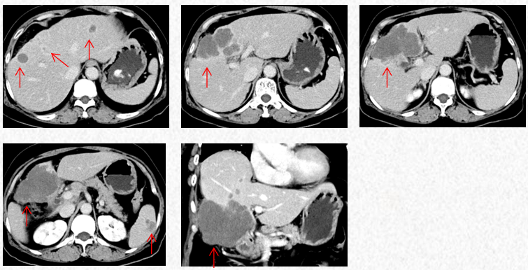 2023-7-15胸腹CT:肝肿物最大横截面积86*58mm,脾脏转移瘤(19*12mm)
