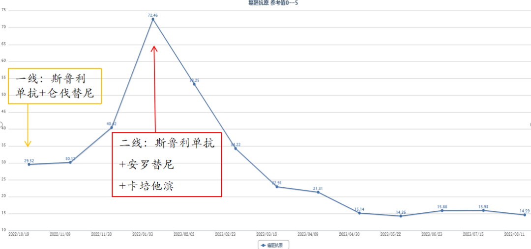 在该例胆管癌治疗过程中,患者于2022年10月确诊为肝内胆管细胞癌IV期,肿瘤侵犯胆囊、结肠肝区及周围腹膜,且伴腹腔淋巴结、肝内、盆腔转移。患者拒绝使用一线GP或者GEMOX方案静脉化疗,一线采用斯鲁利单抗联合甲磺酸仑伐替尼治疗2个周期,疗效评估为PD,二线采用斯鲁利单抗联合安罗替尼和卡培他滨治疗,4程后疗效评估为PR,7程、9程后疗效评价为SD,二线方案治疗至今,PFS超过9个月且未达终点。该病例提示对于晚期胆管癌患者,斯鲁利单抗联合安罗替尼联合卡培他滨治疗可以为患者带来一定的生存获益。