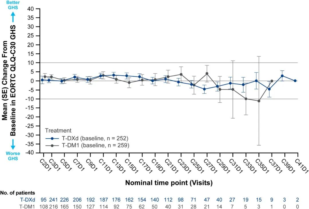 DESTINY-Breast03研究不仅证实了T-DXd的疗效与安全性,更是进一步明确了患者生活质量的获益。患者报告的结局(PRO)显示,在T-DXd中位治疗14.3个月、T-DM1中位治疗6.9个月的条件下,T-DXd组与T-DM1组的欧洲癌症研究与治疗组织生活质量问卷核心30(EORTC QLQ-C30)的整体健康状况/生活质量(GHS/QoL)评分均得以维持,尽管T-DXd治疗时间更长,但GHS/QoL并未恶化。在EORTC QLQ-C30量表、EORTC QLQ-BR45症状量表和EQ-5D-5L VAS中,T-DXd比T-DM1的中位到症状恶化时间(TDD)更长,显示了T-DXd的优势倾向。从而明确了T-DXd在患者生活质量方面较传统方案的改善[15]。