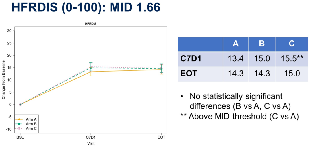 对于HFRDIS,组间无显著差异;但相对于单纯ADT组,ADT联合阿帕他胺和阿比特龙组超出了临床重要差异阈值。